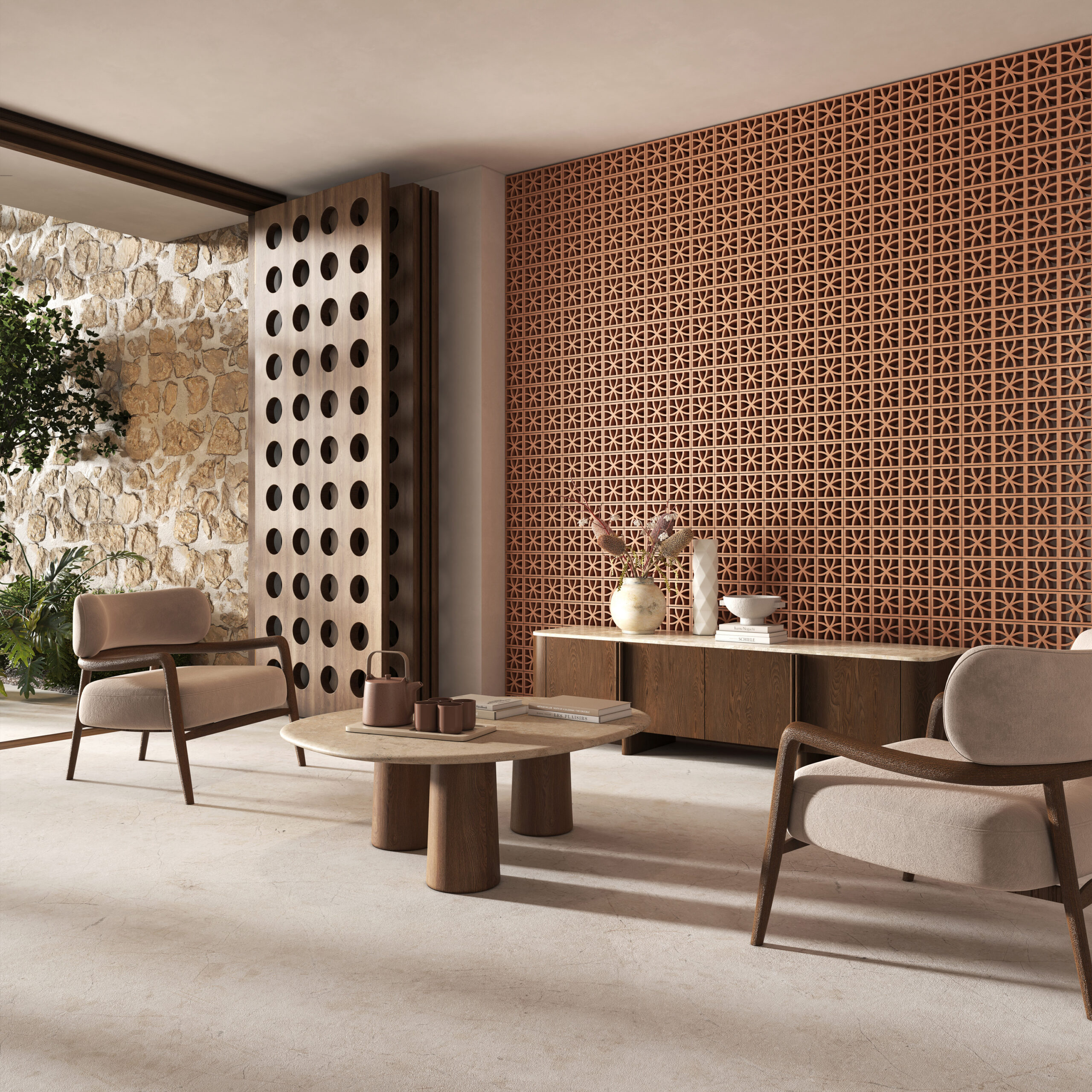 The SeaBreeze collection reinterprets classic breeze blocks through a contemporary lens, combining sculptural forms, tactile surfaces, and artisanal craftsmanship. Featuring five distinctive designs—Loop, Oblique, Circle, Blend Deco, and Blend Flo—it creates rhythmic, light-filled compositions that balance tradition with modern expression.